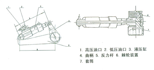 手動高壓泵由操縱手柄,高壓泵、換向閥、油箱、壓力表和帶快速接頭的輸油管等組成。帶棘輪式液壓扳手由高壓油口、液壓油缸、曲柄、反力桿、棘輪裝置、套筒等組成、前者系動力源部件,后者為扭矩執(zhí)行機構(gòu)。